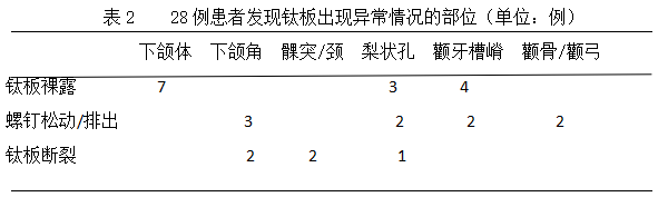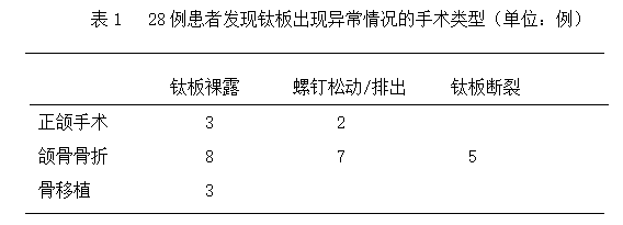 方法:對28例鈦板裸露、螺釘松動或脫落及鈦板斷裂患者的手術(shù)類型、手術(shù)時的情況,鈦板出現(xiàn)異常情況的時間等進行了回顧性分析與研究。