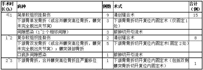 25例急診患者中,入院24 h內(nèi)手術(shù)16例,入院后24~72 h內(nèi)手術(shù)9例。實(shí)施全麻手術(shù)19例(76%),局麻手術(shù)5例。1例下頜骨骨折患者因自覺手術(shù)及麻醉風(fēng)險(xiǎn)過(guò)大,拒絕手術(shù),安排出院。手術(shù)治療的24例患者中,手術(shù)時(shí)長(zhǎng)≤1 h 15例,1~2 h完成8例,2~3 h完成1例(表3)。